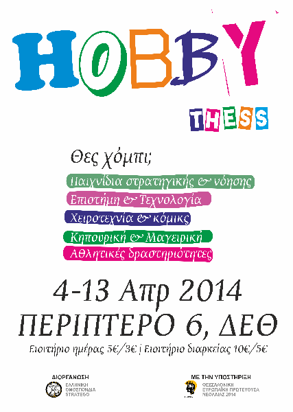 Η Ελληνική Ομοσπονδία Stratego διοργανώνει το φεστιβάλ HOBBYTHESS, 4-13 Απρ 2014, στο Περίπτερο 6 της ΔΕΘ. Πρόκειται για μία δράση η οποία γίνεται για πρώτη φορά στην Ελλάδα.Στόχος του φεστιβάλ είναι να φέρει το κοινό σε επαφή με μία πληθώρα χόμπι, που έχουν σαν κοινό παρονομαστή καταρχάς τον εκπαιδευτικό τους χαρακτήρα. Στον ίδιο χώρο θα διοργανωθούν παρουσιάσεις και δράσεις που θα ενημερώσουν, επιμορφώσουν και εκπαιδεύσουν σε θέματα που αφορούν την οικολογία, την προστασία του περιβάλλοντος, τη δημιουργικότητα, τη φαντασία κ.ά. Το φεστιβάλ θα λειτουργήσει τόσο ως μία πλατφόρμα επικοινωνίας για όσους ήδη ασχολούνται με κάποιο χόμπι αλλά ως τώρα δεν έχουν καταφέρει να έρθουν σε επαφή με "ομοϊδεάτες" αλλά και ως ένα "θεματικό πάρκο" για χόμπι, όπου ο κάθε επισκέπτης θα μπορεί, απλά με το κόστος ενός εισιτηρίου, να ενημερωθεί και -το κυριότερο- να συμμετέχει σε μία πληθώρα εργαστηρίων ή/και δράσεων που θα αφορούν την κάθε θεματική ενότητα.